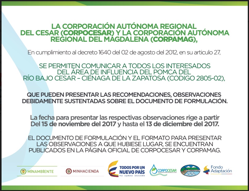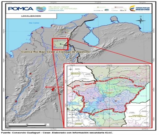 Con el ánimo de contar con un instrumento de planeación efectivo para la Cuenca del Río Bajo Cesar – Ciénaga Zapatosa, que involucre todos los determinantes ambientales exigidos por la legislación ambiental colombiana, la Corporación Autónoma Regional del Cesar “CORPOCESAR” seleccionó y contrató al Consorcio GUATAPURÍ – CESAR para realizar la formulación del Plan de Ordenación y Manejo de la Cuenca Hidrográfica (POMCA) para la Cuenca del Río Bajo Cesar – Ciénaga Zapatosa.